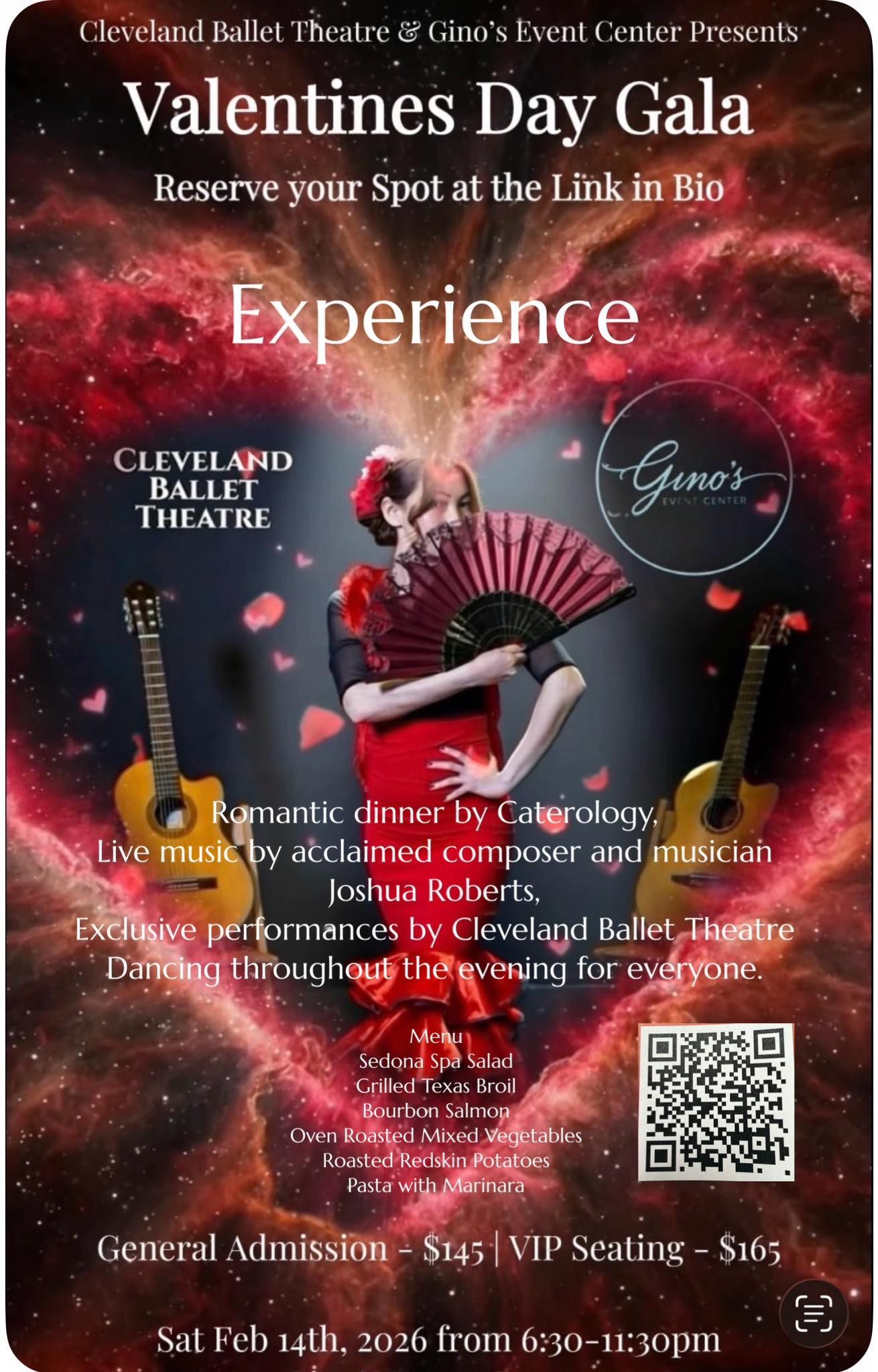 Cleveland Ballet Theatre and Gino's Event Center present a Valentine's Day Gala, Saturday February 14, 2026 from 6:30 to 11:30 featuring a romantic dinner by Caterology, live music by acclaimed composer and musician Joshua ROberts, exclusive performances by Cleveland Ballet Theater, and dancing throughout the evening for everyone. Ticket sales end February 4 2026.