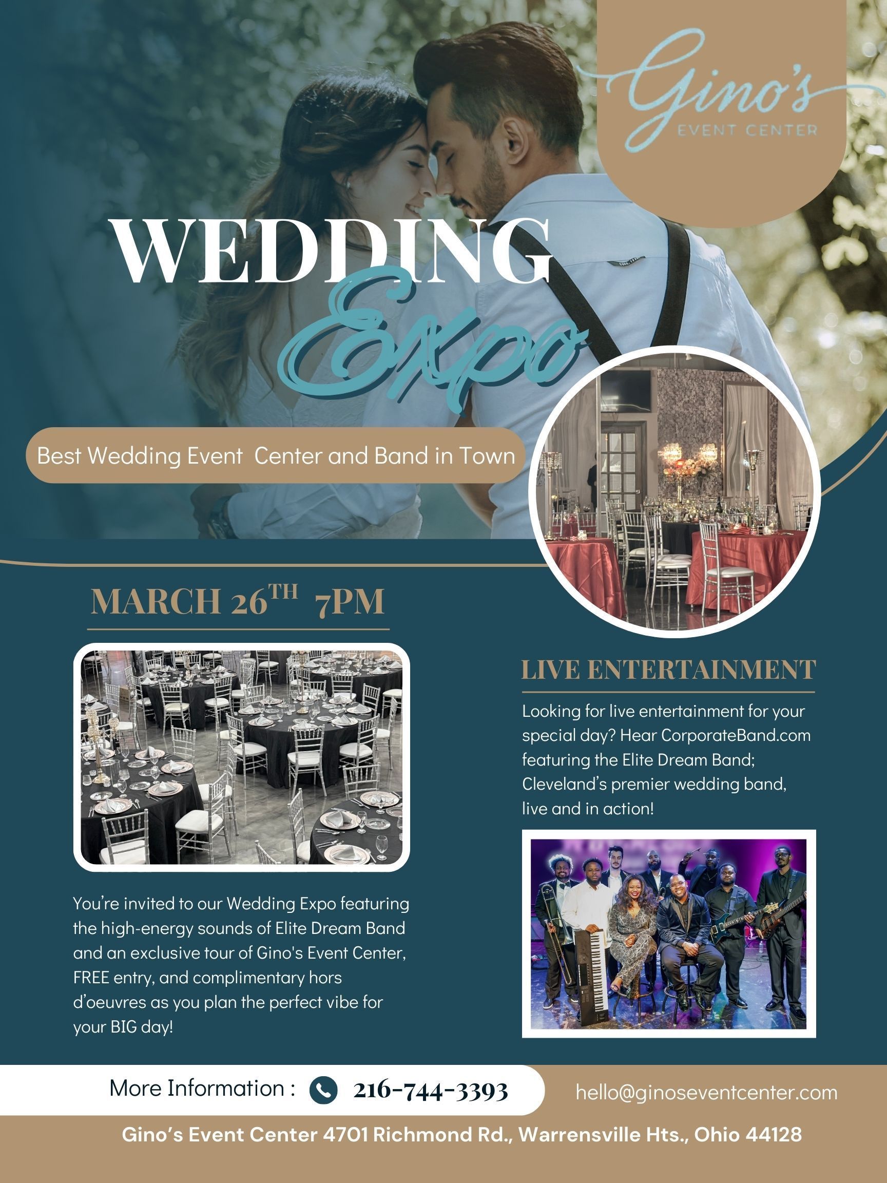 Join us for the Gino's Event Center Wedding Expo! Take the great opportunity to tour our new venue while enjoying free hors d'oeuvres, live music with The Corporate Band, dancing and our surprise DJ (cash bar is available).